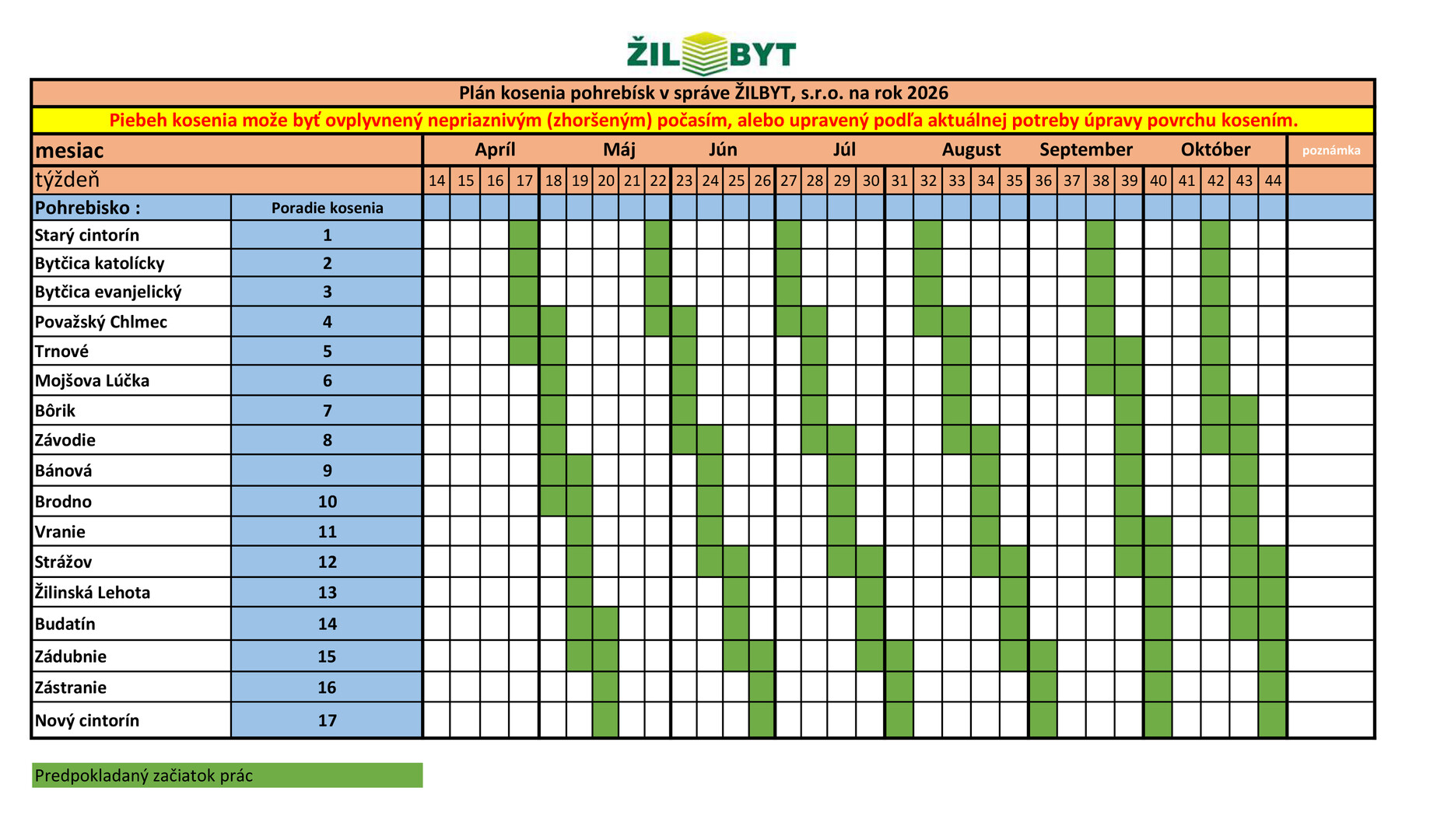 Časový rozvrh kosenia pohrebísk na rok 2026 je zverejnený pre jednotlivé lokality. Sledujte aktuálne termíny, aby ste mali prehľad o plánovanej údržbe cintorínov vo vašom okolí.